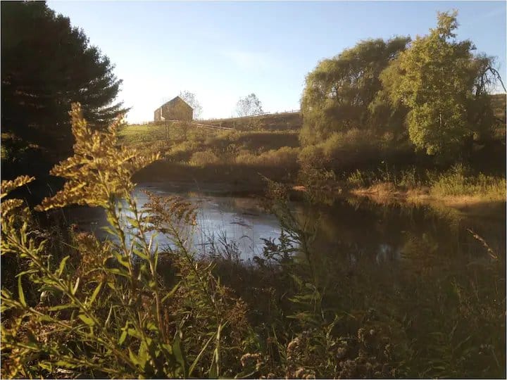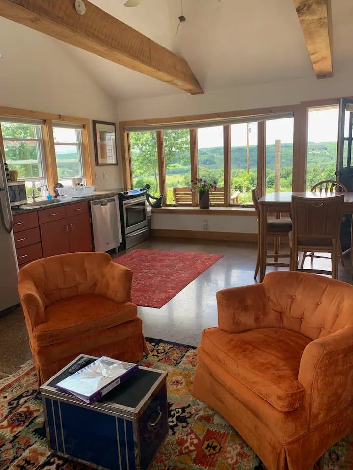 Retreat to the peaceful surroundings of the II Mills Farm Retreat Guest Quarters, a charming studio apartment located between the town centers of Afton and Bainbridge, NY. Perfect for solo travelers, couples, or small families, this cozy retreat offers stunning valley views and a relaxing atmosphere.