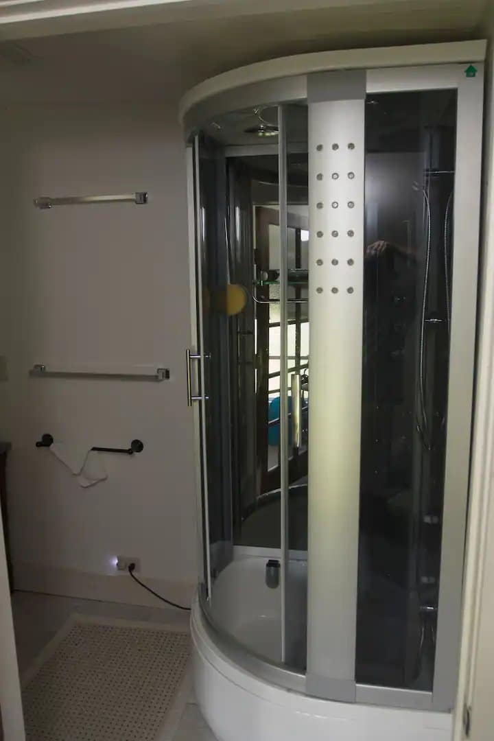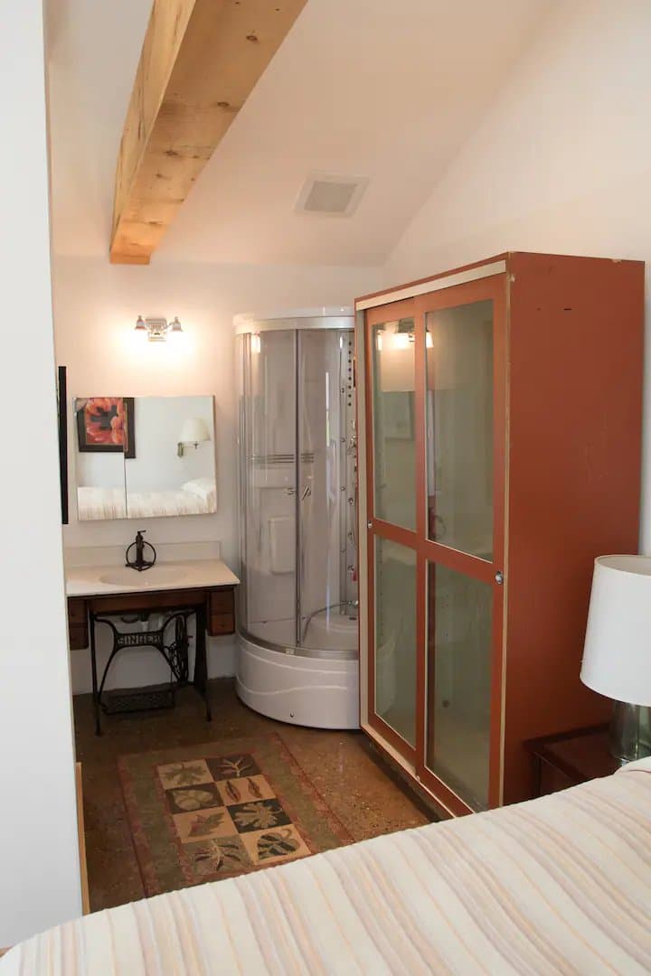 • Luxurious Bath: Pamper yourself in the shower/steam bath, a perfect way to unwind after a day of exploring. The bathroom area is open to the bedroom, adding to the studio’s spacious feel.