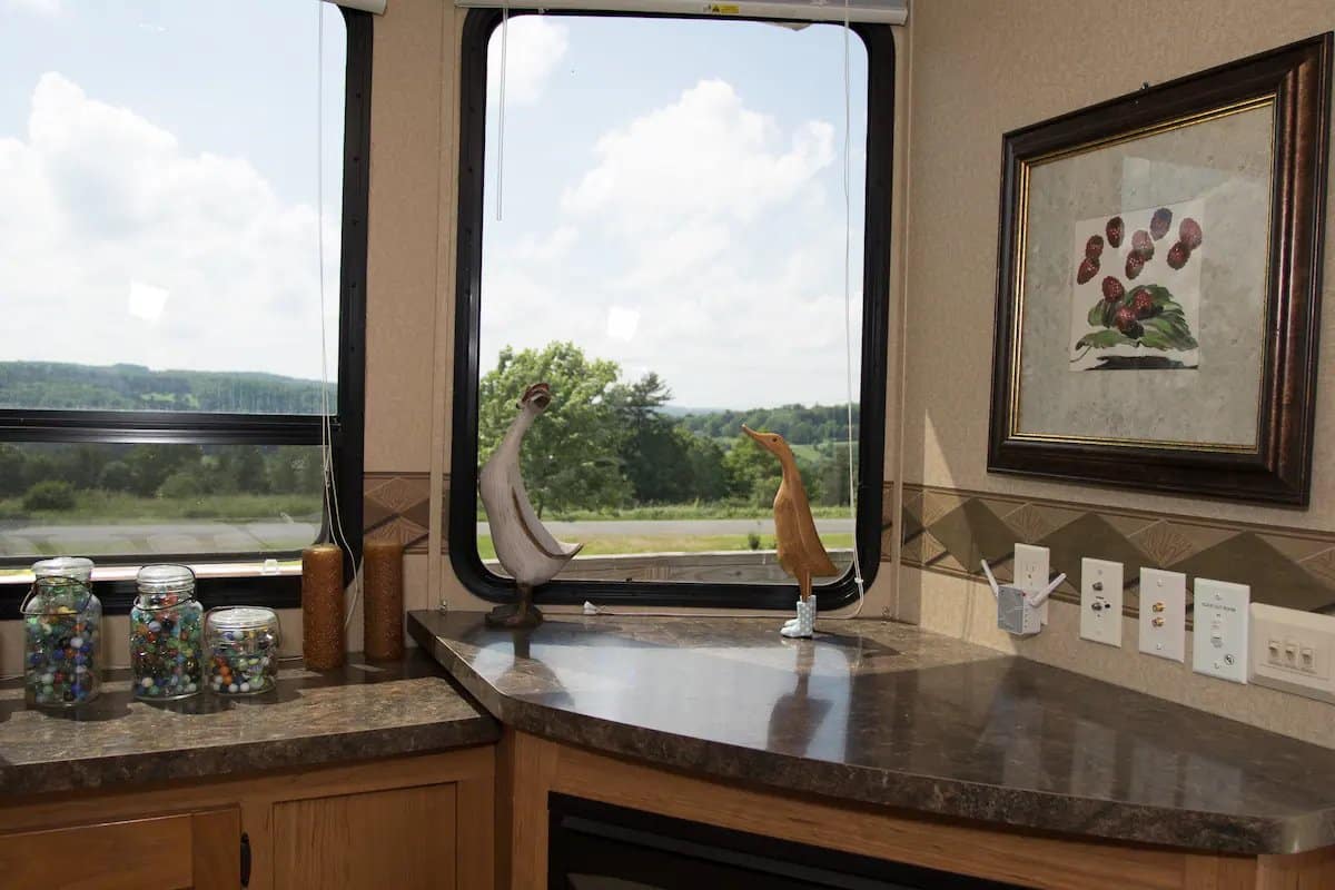 - Spacious Living Area: The camper offers a comfortable living space with large windows that provide stunning views of the rolling hills and gardens. The gas fireplace adds warmth and ambiance, creating a perfect setting for relaxation.